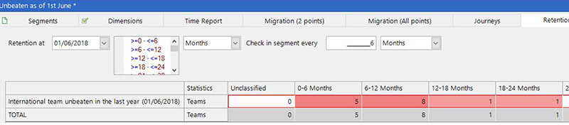 By utilising the Retention report in the Segmentation tool, we can then look at how long these teams have been unbeaten for. The analysis below shows the 15 teams that were unbeaten on 01/06/18. However 5 of them had been in that segment for less than 6 months – meaning that they had lost a game in the 6 months before 01/06/17. A further 8 had been beaten in the 6 months before that, and only 2 teams have currently been unbeaten for at least 2 years.
