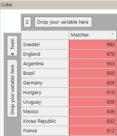 Only a subset of the above data is going to be used in the following analysis. The relevant data comprises international matches ranging from 1872 to June 1st 2016. During that time, a total of 244 teams have played nearly 78,000 matches. The first international matches were between England and Scotland, and gradually over time other countries started playing matches. Surely we should expect that England have played the most international fixtures? Here’s a cube showing the teams with the most matches.