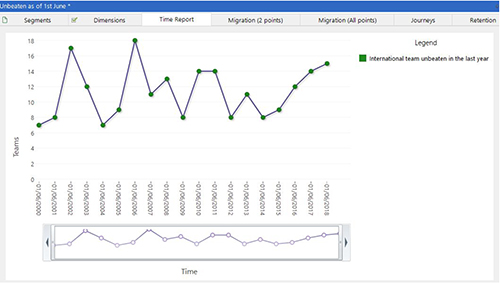 The Segmentation tool allows us to specify a set of time points that we’re interested in reporting on and relating to unbeaten teams. So in the chart below we’ve shown teams that were unbeaten for at least a year on the 1st of June for every year between 2000 and 2018. It would have been easy to extend this back to the 1930s with one simple change to the report.