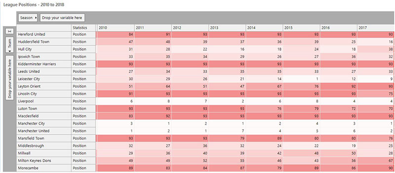 Let’s move things up a notch and pull together a consolidated league table for the top four English divisions and place each of the teams from 1-92. By then adding season as a dimension we can then track the finishing positions of teams over multiple seasons.
