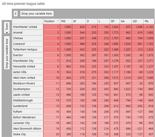 This technique could also be used to do multi-season league tables. The example below shows the top teams when the results of all the seasons since the Premier League started are taken into account.
