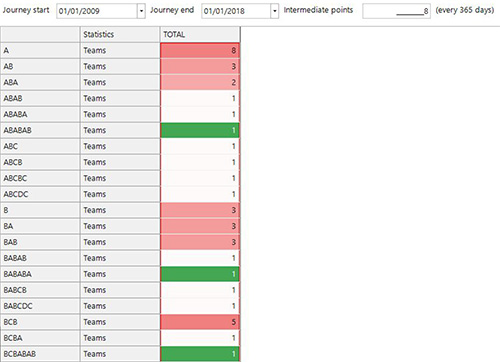 We can use the Segmentation Journeys tool to answer this question. By setting the start and end points of the journey to be 01/01/2009 and 01/01/2018 and with eight intermediate points we can look at the divisions a team has been in during the last 10 years (here A,B,C,D represent the divisions 1-4 respectively).