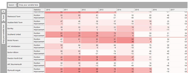 An extension of the above analysis allows us to compare teams over time. Which teams have improved or maintained their finishing positions over the last few seasons? Many teams can boast four consecutive years of this, but both Plymouth and Preston North End have had six seasons. Can they keep that going this year? (3)