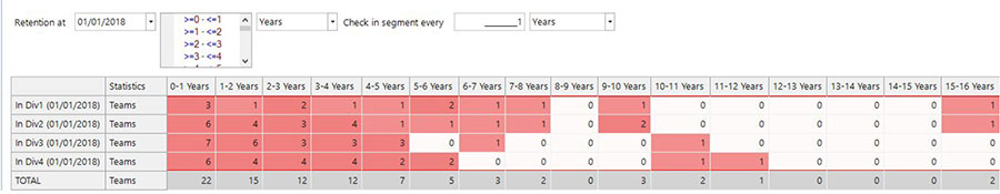 We can now use the retention tool to look at how long each team has been in any division from any given season. We only need to check which segment a team is in once a year as they cannot change more regularly than that. By setting our bands to one yearly, we can then break the teams down into exactly how many years they have been in the division for. This gives us some expected results – the first column here (3, 6, 7, 6) shows the teams that were promoted/relegated into that division for this season.