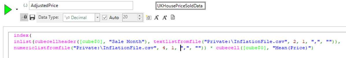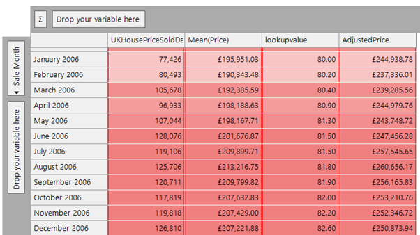 We can then use an expression to lookup the value of the header month, matching on column number 2 in this file, return the multiplier value and then multiply it by the average price in that month to standardise the prices.