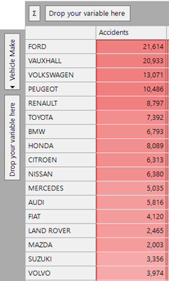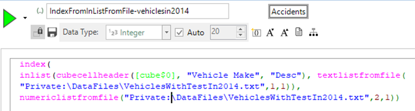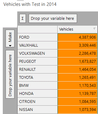 We can use the expression shown below to return the number of vehicles of that type that had an MOT as a statistic on the cube. The CubeCellHeader expression looks up the vehicle make description on the cube dimension, finds it in the file and then returns the corresponding vehicle count column: