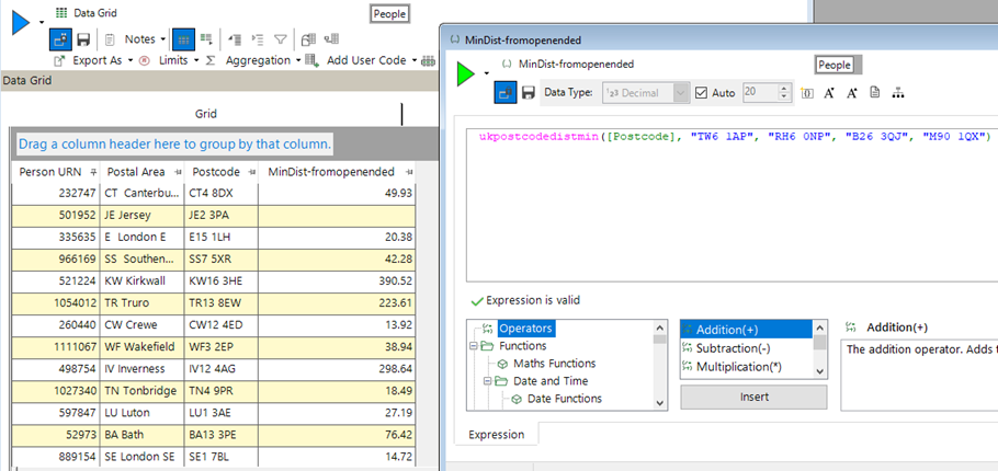 There may be instances in which the analyst wishes to explore the likely impact of adding a new store at a given location. Rather than having to add this to the file (which may be in production use and unable to be edited), the expression above can take any number of file or individual parameters – which means that we could have added the Glasgow postcode as an extra parameter directly in the expression to see the effect on say the mean minimum distance for our highest value customers.