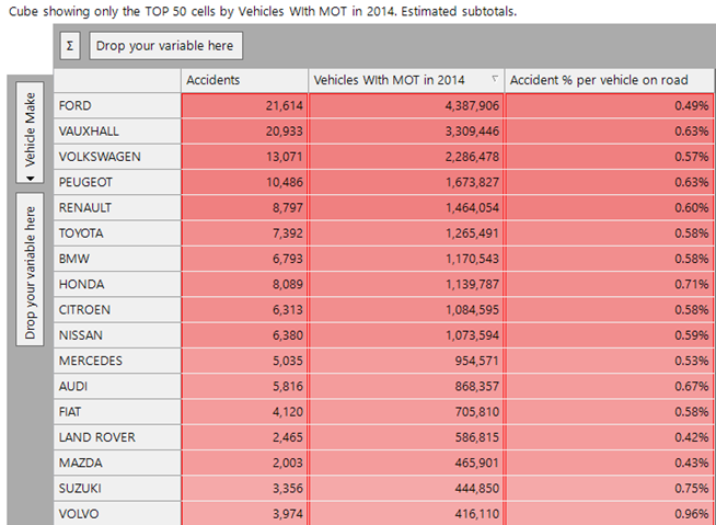 Below is a cube showing vehicles which had accidents in 2014 broken down by car make.