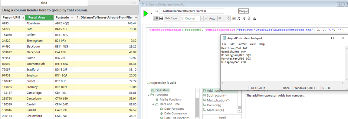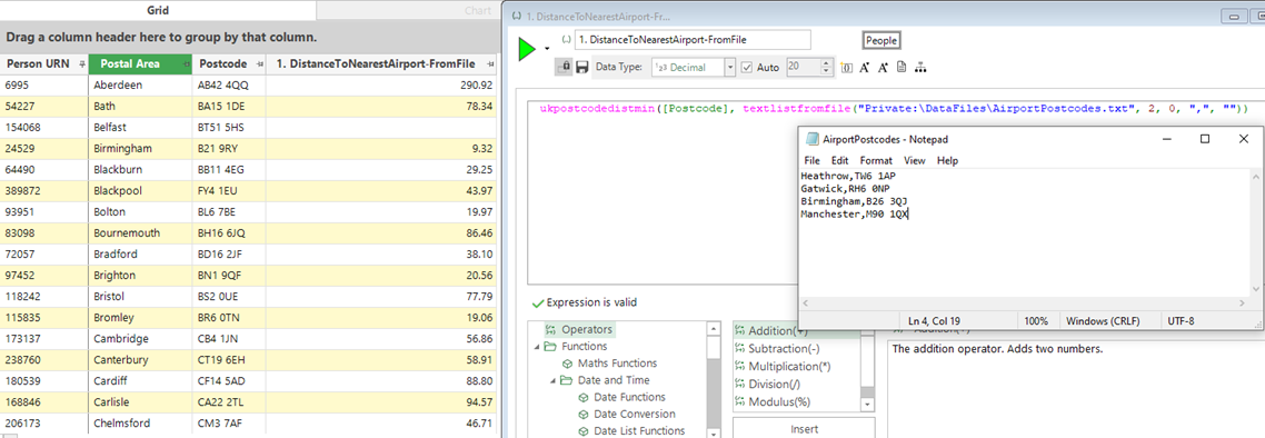 In the following example, we have data on customers of our holiday business and the bookings that they have made. We can imagine a scenario where our company flies from 4 UK airports (Heathrow, Gatwick, Birmingham and Manchester). It is then easy to construct an expression which will give us the distance to the closest of these as follows: