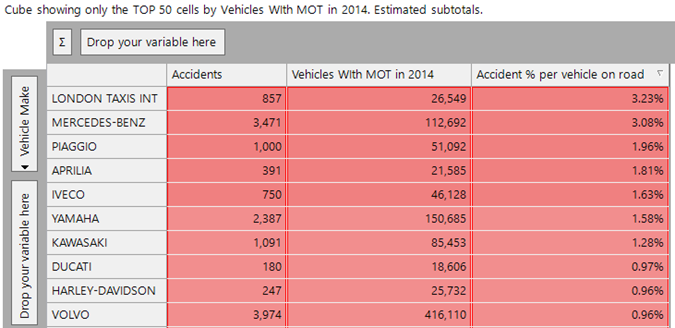 Six of these are predominantly motorbike manufacturers. Of the remaining, Iveco are mainly lorries, Mercedes Benz (which has a mixture of cars and lorries). We discussed Volvo in the previous paragraph. Finally, London taxis comes top of the list as having the highest accidents to vehicles ratio.