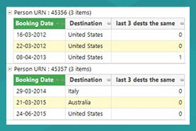 These new aggregations are computed as required in the calculations. This technique of aggregations is already used in our software to enable drag-offs from transactional analysis results – for example, if you were to select all individuals who have been to Greece, then Australia, then Portugal, with less than 400 days between each transaction.