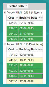We can then make a selection of people with a value of 1, and look at the relevant transactional detail to check that they are exhibiting the desired behaviour (as shown in the highlighted rows for two example people). Note that these behaviours are at different points within the transactional history for the two highlighted people.