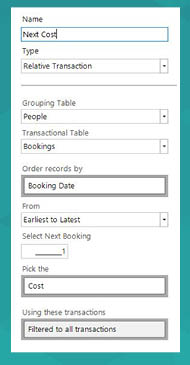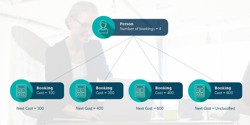 In the diagram above, the person has 4 bookings. The ‘Frequency’ of 4 bookings is an attribute of the Person. Each booking has a cost associated with it. The ‘Next Cost’ (or Cost of the Next Booking) is an attribute of each booking record. The final booking doesn’t have a ‘Next Cost’ associated with it.