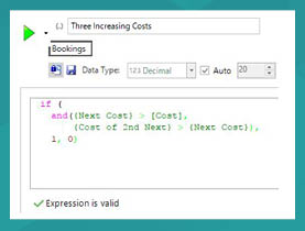 The resulting expression from the new FastStats® aggregation functionality is shown below. Notice how we have compared the cost of the current booking to the next one, and then compared the next one to the one after that. If both these conditions hold they will return a value of 1, otherwise they will return a value of 0.