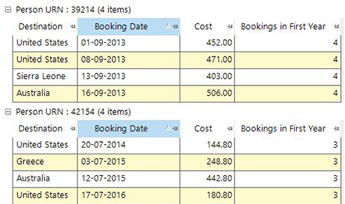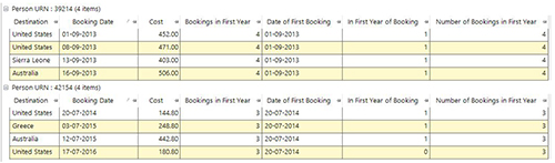 Secondly, we would need to create an expression to flag all records where the transaction date of that record was within one year of the variable we created in the first step (see In First Year of Booking column below). We could then use this as an attribute to apply the RFV selection to, or as a transactional selection within a further frequency virtual variable to create the required value as a variable (see Number of Bookings in First Year column).