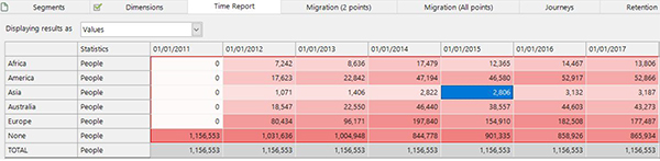 We then create selections based on the above expression for the six possibilities and use those as the definitions of our segments. For each time point within the Segmentation time report the filter selections are translated to ‘The Last Year’ based upon the reporting point. In the report below, the highlighted figure of 2,806 are the customers who had more holidays to Asia than any other continent in the year prior to 01/01/2015 (i.e in 2014) (1).
