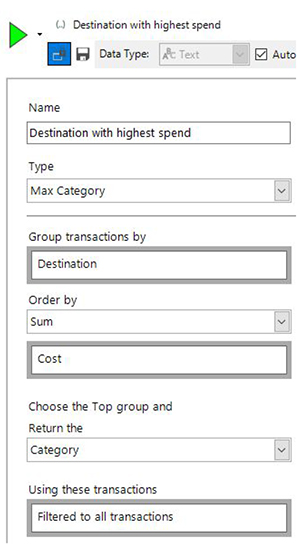 There are a number of different ways of ordering the resulting groups. We’re then able to choose which function to apply to the resulting best set in order to return a value. Some of them are numeric (such as working out the amount I’ve spent on my highest value destination). The one in the example above is categorical – it will return the name of the destination.