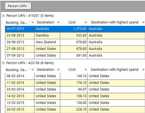 We can check the results of this aggregation by adding the expression to a data grid. In the example of the top person, the sum of their one transaction to Australia is greater than the sum of their two to the USA.