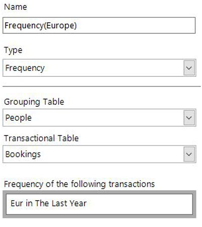 We’ve been unable to formulate up segmentation selections to answer questions for some scenarios as we needed the ability to have aggregations with transactional filter selections containing relative date sliding windows. In the example below we have the definition of a simple Frequency aggregation with a transactional filter to only include bookings made to Europe in the last year.