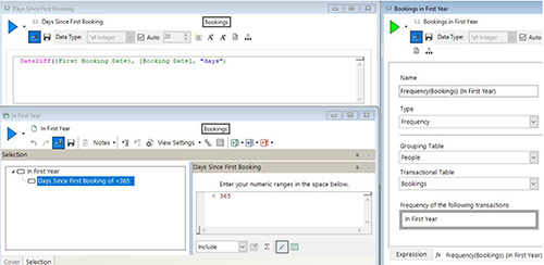 The first booking date is specified as an on-the-fly recency aggregation. In the bottom right we can then use this expression in a selection to select all bookings where this value is <365 (i.e falls in the first year). We can then use that in a further expression as the transactional filter selection on a frequency aggregation to work out the number of bookings in the first year.