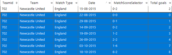 Three other teams had 21 consecutive league matches (Carlisle starting on 07/02/1953, Manchester City starting on 01/10/1894, Wrexham starting on 29/09/1965). Since the turn of the millennium the longest run is 18 matches starting on 13/05/2001 by Bradford City. - For increasing matches the sequence is seven for Newcastle United in 2015 as shown in the screenshot below. We do not know in advance how many matches the longest sequence will be so I set out a pattern of 10 >, then 9 > etc down to 1 > to find the longest increasing sequence for each team and put this on a cube dimension. I then chose the one team with a seven-match run. To find when it was I then added a data grid with the relevant fields and also a date field to show when the sequence started so I could find the sequence in the thousands of matches that Newcastle United have played.