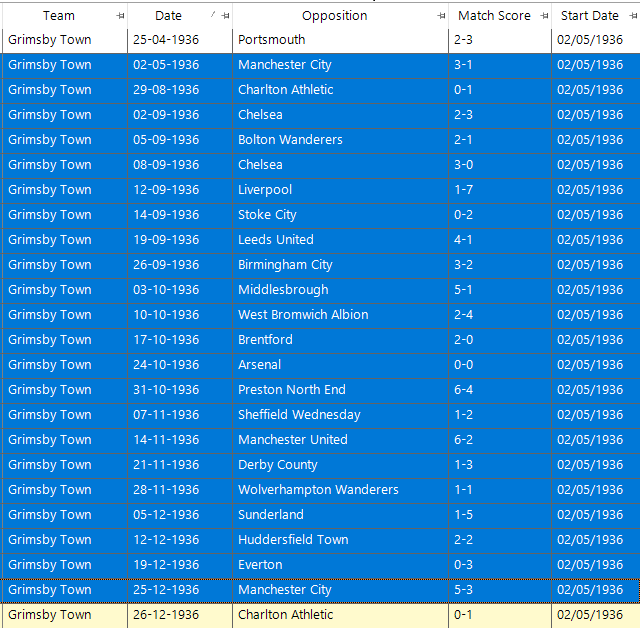 - Starting on 02/05/1936 and lasting until 25/12/1936 Grimsby Town had 22 consecutive league matches before repeating any of the scorelines.