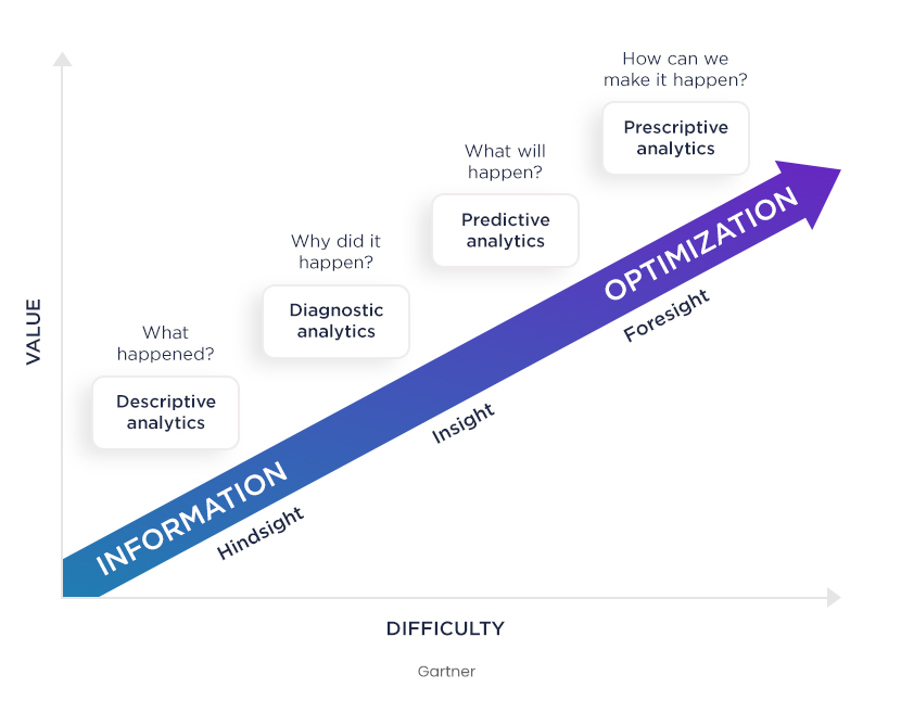 Predictive analytics sits between “Insight” and “Foresight” in Gartner’s diagram for the four phases of data analytics maturity.