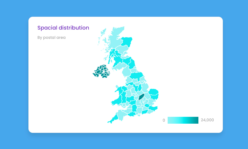 Maps are best for showing a geographical representation of data. They’re the obvious choice for visualising location-specific questions about your customers. For example: